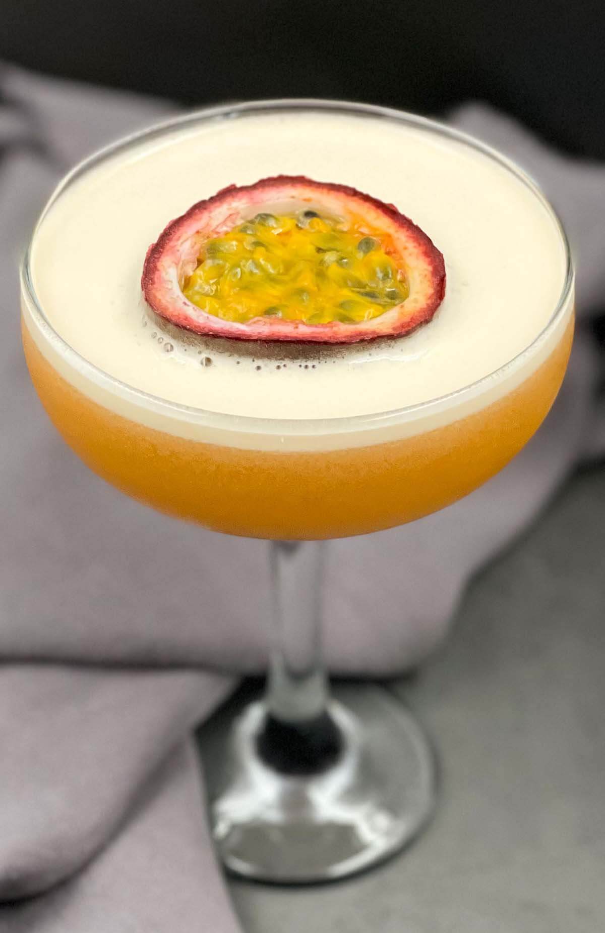 Passion Fruit puree, Passoa, Vodka, lime juice, prosecco. Topped with a passion fruit slice. Piure de fructul pasiunii, Passoa, vodcă, suc de lămâie verde, prosecco. Garnisit cu o felie de fructul pasiunii. |